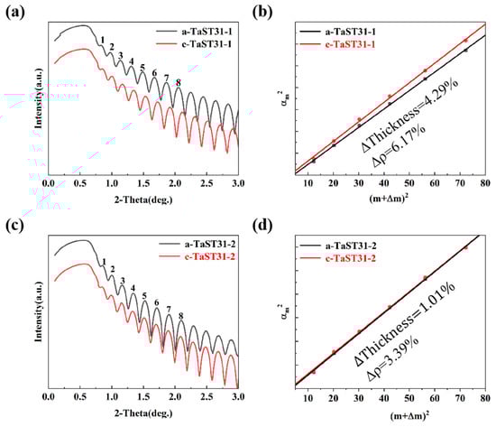 Bruker D8 Discover’s X-ray reflectivity (XRR) investigations can be used to look at how the thickness and density of the films change both before and after crystallization. Figure 4a,c show the XRR diffraction images of the TaST31-1 and TaST31-2 films, respectively. The density change values for the amorphous and crystalline phases of the TaST31-1 and TaST31-2 films are shown in Figure 4b,d, respectively. The principle of operation of XRR is to take advantage of the reflection and refraction phenomena that occur on the surface of the sample when X-rays are reflected. The refracted light enters the interior of the sample and is reflected and refracted again at the Si substrate interface. The two reflected beams interfere to produce interference fringes []. Figure 4a,c show that the XRR curves of the Ta-doped Sb3Te1 films are wavy, with multiple peaks and troughs. The numbers 1–8 in the figures are the number of wave peaks. Based on the displacement of the peaks, fitting calculations are performed to show the thickness and density change corresponding to the amorphous to crystalline transition from Figure 4b,d. In the figures, the exact film thickness d can be deduced from the slope of the curve [] and the critical angle calculated from the intercept () on the y-axis. The density change of the film is calculated from Equation (1):