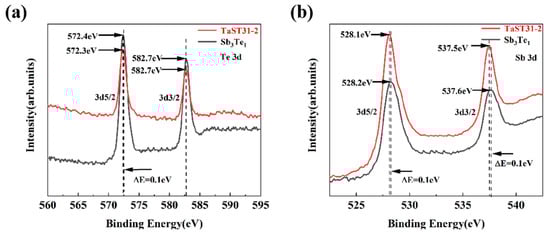 The chemical bonding properties of Sb3Te1 and TaST31 films in the crystalline form were examined by the XPS method in order to examine the influence of Ta doping. Figure 5a,b show the XPS spectra of Te3d and Sb3d, respectively. In Figure 5a, it can be seen that the bond energies of 572.4 eV and 582.7 eV in the Sb3Te1 film correspond to Te 3d5/2 and 3d3/2, respectively, and the bond energies of 572.3 eV and 582.7 eV in the TaST31-2 film correspond to Te 3d5/2 and 3d3/2, respectively. The result indicates that by doping Sb3Te1 with Ta element, the binding energy of Te will shift towards a lower binding energy. As shown in Figure 5b, it is also observed that the bond energy of Sb 3d5/2 is reduced from 528.2 eV to 528.1 eV and the bond energy of Sb 3d3/2 is reduced from 537.6 eV to 537.5 eV with lower binding energy. The electronegativities are 1.4, 2.05, and 2.1 for Ta, Sb, and Te elements, respectively [], making a stronger Ta-Te bond than an Sb-Te bond. Ta tends to combine with Te to form more Ta-Te bonds and extra Sb-Sb bonds. The bond energy of the Ta-Te bond is larger than that of the Sb-Te bond, indicating that more energy is required to break the Ta-Te bond, resulting in better thermal stability [,]. Therefore, the thermal stability of Sb3Te1 films was improved after doping with Ta elements.