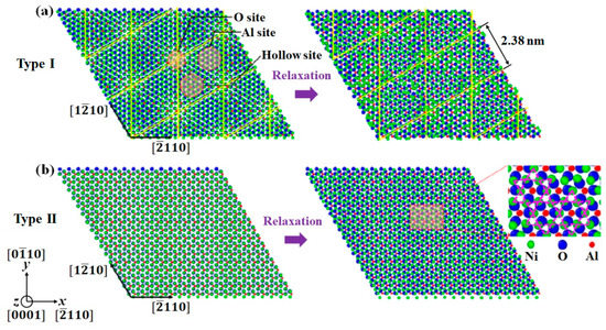 - Long, Y.; Chen, N.X. Interface reconstruction and dislocation networks for a metal/alumina interface: An atomistic approach. J. Phys. Condens. Matter 2008, 20, 135005. [Google Scholar] [CrossRef]