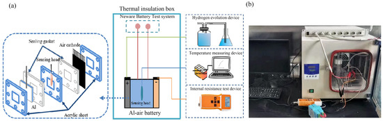 A self-designed thermal effect test system was assembled as shown in Figure 2. The experimental environment temperature was controlled at 25 °C ± 1 °C. The battery was subjected to constant-current discharge tests using a Neware battery test system (CT-3008-5V3A-164, Neware Technology Limited, Shenzhen, China). The distance between the anode (pure aluminum, 99.9 wt. %) and air electrode consisting of commercial MnO2/C catalyst is 1 cm with 4 M NaOH solution as the electrolyte [28,29]. Prior to testing, the aluminum electrode, with an active area of 50 mm × 50 mm, was abraded with silicon carbide paper and then rinsed with deionized water.