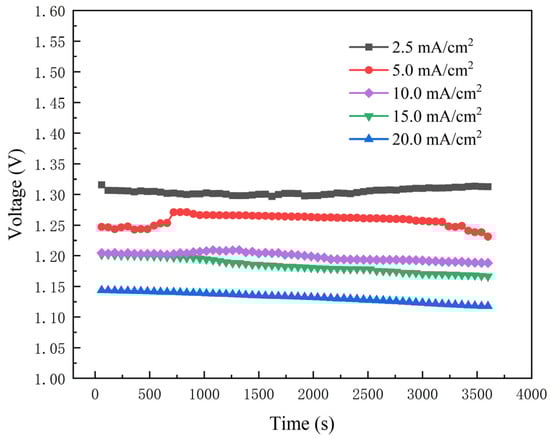 The discharge curves for the aluminum-air battery at different discharge current densities for 1 h are shown in Figure 3. It can be seen that the discharge voltage decreases with the increase in current density. The heat generation results for each part of the aluminum-air battery were obtained by discharging at different current densities.