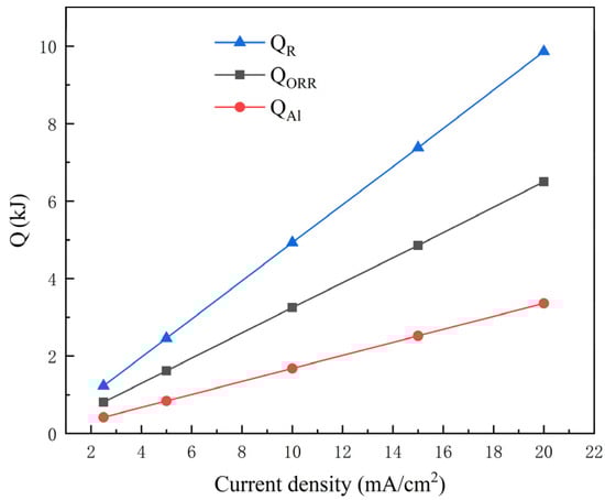 Calculation results for QAl, QORR, and QR with different discharge current densities.
