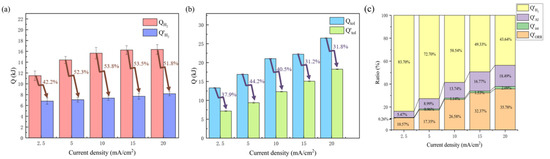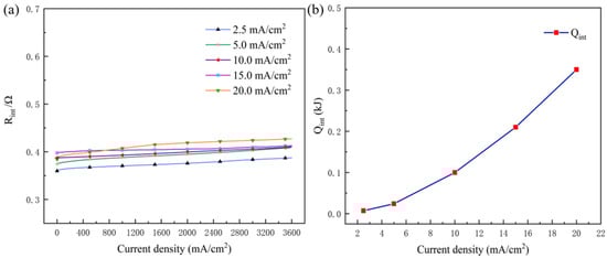 Qint was introduced to directly characterize the sum of QJ and QP. The internal resistance (Rint) of the battery was measured at different discharge densities, as shown in Figure 5a, and the corresponding values of Qint are exhibited in Figure 5b. It can be observed that Rint increased slightly (from 0.35 and 0.4) with current density, exhibiting little change with discharge time. Therefore, the values of Qint calculated by Equation (25) are mainly determined by discharge current density.