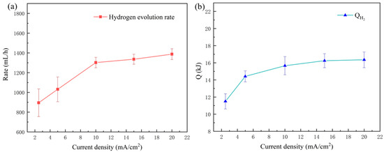 QH2 is the heat released by the hydrogen-evolution reaction, and the corresponding evolution rate of hydrogen from the aluminum electrode was recorded during the discharge process (Figure 6a). The hydrogen-evolution rate maintained an upward tendency to 1400 mL/h with a current density of 20 mA/cm2. The increasing hydrogen-evolution rate slowed when the current density was greater than 10 mA/cm2. This observation is mainly attributed to the increase in hydrogen-evolution potential induced by aluminum electrode polarization and the resulting inhibition effect on the hydrogen-evolution reaction [25]. In accordance with Equations (28) and (31), the values for QH2 also exhibited a similar trend, as shown in Figure 6b.