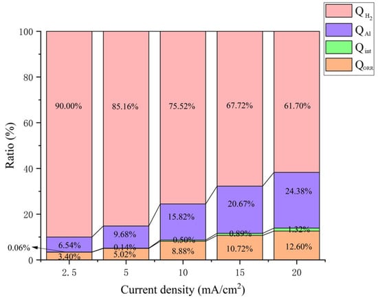 The proportion of QAl, QORR, Qint, and QH2 in Qtol under different discharge current densities.