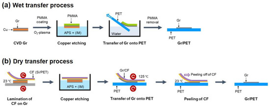 Schematics showing the fabrication processes of the Gr/PET films with two conventional Gr transfer methods. (a) Wet transfer and (b) dry transfer methods.