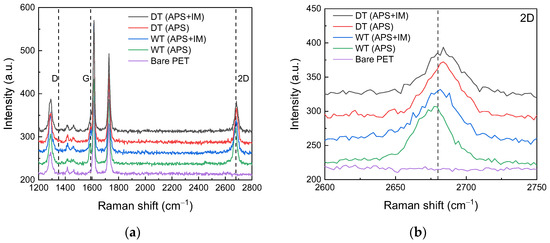 Raman characterization of the microstructural properties of the Gr/PET films and the bare PET substrate. (a) Raman spectra and (b) enlarged graph comparing Raman 2D bands.