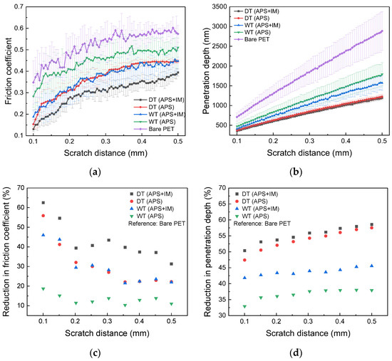 Figure 4 shows the comparison of the friction coefficient and penetration depth of the fabricated Gr/PET films, where the data from the bare PET substrate are inserted for comparison. The average values and standard deviation of 30 nanoscratch test results are plotted in Figure 4a,b (Tables S1 and S2), and these average values were used to calculate the reduction ratio of the friction coefficient and penetration depth with respect to the bare PET substrate, as shown in Figure 4c,d. As shown in Figure 4a,c, the Gr coating on the PET substrate clearly lowers the friction coefficient, thereby improving the frictional properties. Compared to the value of the bare PET, it is reduced by ~13% for WT (APS), ~25% for WT (APS + IM) and DT (APS), and ~40% for DT (APS + IM) (Figure 4c). Considering that graphene has a significantly lower friction coefficient (~0.03) [29] than PET (~0.3) [30,31], the reduction of the friction coefficient by the Gr coating is rationalized. It is noted that for all the Gr/PET films and the bare PET substrate, the friction coefficient gradually increases with the scratch distance (Figure 4a). This is because the normal force applied to the film progressively increased during the nanoscratch test, causing a deeper penetration of the scratch probe into the Gr/PET film, thereby leading to a different contact condition between the scratch probe and film with increasing scratch distance, and thus, requiring a greater lateral force for the scratch probe to scratch the film surface. Another interesting result was that the degree of improvement of frictional properties was significantly dependent on the Gr transfer method and imidazole treatment. Regardless of the imidazole treatment, the dry-transferred Gr exhibited a lower friction coefficient than the wet-transferred Gr; the reduction ratio of the friction coefficient was almost double in the dry-transferred Gr (Figure 4c). In addition, the imidazole treatment effectively reduced the friction coefficient for both the wet-transferred and dry-transferred Gr. After the imidazole treatment, the reduction ratio of the friction coefficient increased by ~100% for the wet-transferred Gr and ~60% for the dry-transferred Gr (Figure 4c).