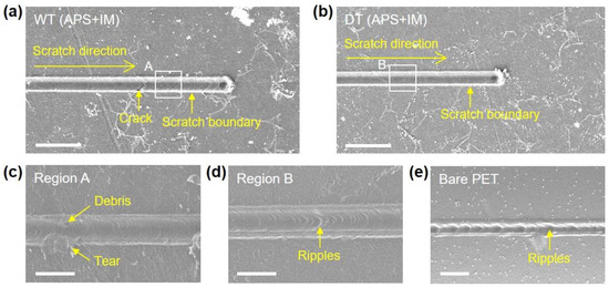 SEM micrographs showing the scratch traces on sample surfaces. (a) WT (APS + IM) and (b) DT (APS + IM) (scale bar: 20 µm). Enlarged images of (c) region A in (a), (d) region B in (b), and (e) bare PET substrate (scale bar: 4 µm).