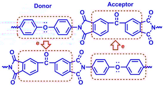 However, the color of aromatic PI films is typically yellow or brown, with poor light transmittance. For instance, Kapton™, with a thickness of 80 μm, exhibits a brown color, and its cut-off wavelength (initial wavelength corresponding to light transmittance exceeding 1%, λ0) locates as long as 455 nm. A 50 μm Kapton™ obtains light transmittance (T%) of merely 80.9% at 760 nm [54]. The deep color of PI films results from the formation of intra- and intermolecular charge transfer complexes (CTCs, as plotted in Figure 2) between aromatic dianhydrides (electron acceptors) and diamines (electron donors), causing strong filtration in the visible region. The generation of CTCs depends on the energy gap between the highest occupied molecular orbital (HOMO) of diamine and the lowest unoccupied molecular orbital (LUMO) of dianhydride monomers [55,56]. The larger energy gap leads to the light absorption of a shorter wavelength, a lighter color of PIs. Moreover, electron conjugation in PIs is mainly determined by molecular structure and chain aggregation state, which is essential for evaluating their transparency properties, including T%, λ0, and yellowness index (YI).