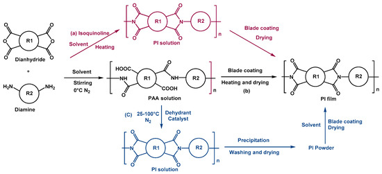 High-molecular-weight aromatic PIs with pyromellitic dianhydride and diamines retained their properties and performance up to ~500 °C and were successfully synthesized by a two-stage polycondensation in 1955. Figure 5 illustrates the simple routes for the traditional preparation of PI via the poly (amic acid) (PAA) method. The reaction of dianhydrides and diamines subsequently formed PAA and then converted to PI through thermal/chemical imidization. Typically, most high-performance aromatic PIs adopt the PAA imidization route, ascribing to their being poorly soluble in common solvents [75,76]. Dianhydride and diamine require purification, such as sublimation, to achieve stoichiometric balance, thus obtaining the high viscosity of the PAA solution. Note that dianhydrides are very sensitive to water, and diamines are easy to be oxidized by oxygen. Hence, the reactant solvent should be desiccated, and the polymerization must be conducted in oxygen-free conditions (in Ar or N2) [77]. Finally, the PAA is converted into high-performance PI films after imidization.