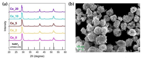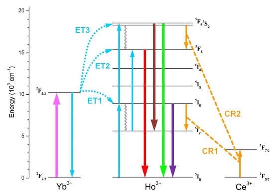 - Pilch-Wróbel, A.; Zasada, J.; Berdnarkiewicz, A. The influence of Ce3+ codoping and excitation scheme on spectroscopic properties of NaYF4:Yb3+, Ho3+. J. Lumin. 2020, 226, 117494. [Google Scholar] [CrossRef]
