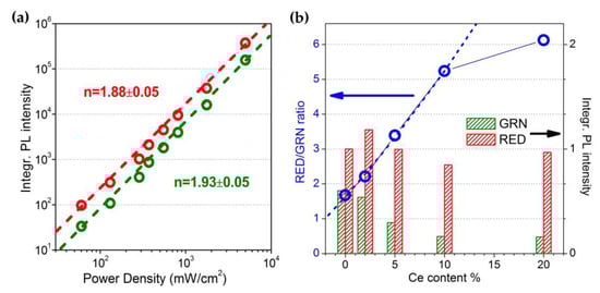 - Giordano, L.; Du, H.; Castaing, V.; Luan, F.; Guo, D.; Viana, B. Enhanced red-UC luminescence through Ce3+ co-doping in NaBiF4:Yb3+/Ho3+(Er3+)/Ce3+ phosphors prepared by ultrafast coprecipitation approach. Opt. Mater.: X 2022, 16, 100199. [Google Scholar] [CrossRef]