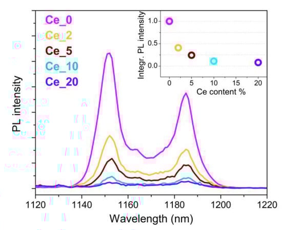 - Cattaruzza, E.; Battaglin, G.; Visentin, F.; Trave, E.; Aquilanti, G.; Mariotto, G. Enhanced photoluminescence at λ = 1.54 μm in the Cu-doped Er:SiO2 system. J. Phys. Chem. C 2012, 116, 21001–21011. [Google Scholar] [CrossRef]