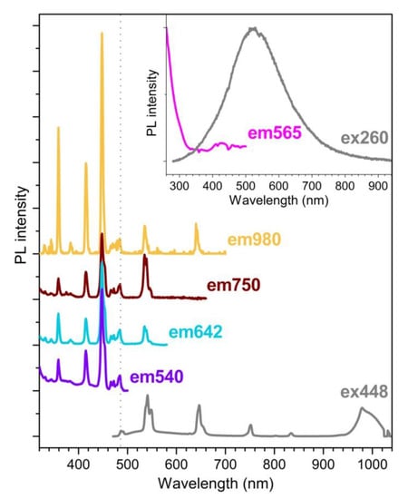 - Back, M.; Trave, E.; Mazzucco, N.; Riello, P.; Benedetti, A. Tuning the upconversion light emission by bandgap engineering in bismuth oxide-based upconverting nanoparticles. Nanoscale 2017, 9, 6353–6361. [Google Scholar] [CrossRef] [PubMed]
