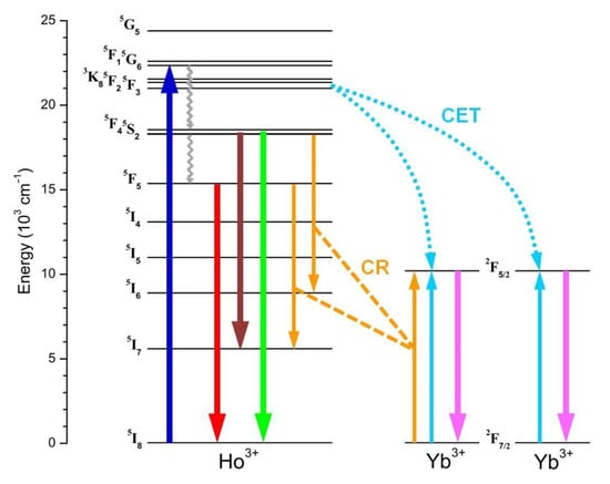 - Lin, H.; Chen, D.; Yu, Y.; Yang, A.; Wang, Y. Near-infrared quantum cutting in Ho3+/Yb3+ codoped nanostructured glass ceramic. Opt. Lett. 2011, 36, 876–878. [Google Scholar] [CrossRef] [PubMed]