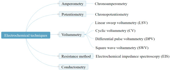 Electrochemical-based detection methods, including electrochemistry, electrochemiluminescence (ECL), and photoelectrochemistry (PEC) methods, can convert analytical signals generated by target molecules into readable electrical signals, and they have the inherent advantages of excellent sensitivity and selectivity, simple operation, rapid detection, cost-effectiveness, simultaneous detection of multiple biomarkers, and potential for miniaturization [26]. Electrochemical techniques can be divided into five categories in accordance with the measurable signals: amperometry, potentiometry, resistance methods, voltammetry, and conductometry (Figure 1). Among them, voltammetry and electrochemical impedance spectroscopy (EIS) are often used for the construction of electrochemical biosensors, sensor characterization, and quantitative analysis [27,28]. Voltammetry has the advantages of simple operation, intuitive atlas analysis, widespread effectiveness, and high sensitivity. EIS has no significant influence on the system during the measurement process. It provides more interface structure and electrode dynamics information than other electrochemical methods.