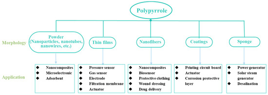 As shown in Figure 3, PPy—with different morphologies including nanoparticles, nanotubes, nanowires, nanorods, nanocapsules, thin films, nanofibers, and hydrogels—can be utilized as a conductive material, electrical display material, electrochromic material, or photoluminescent quencher [35,83,84] in the construction of chemical sensors, biosensors, optical sensors, actuators, flexible electronics, transistors, electrochemical batteries, biofuel cells, photovoltaic cells, electrochromic displays, wearable and implantable/connectable biomedical tools, and other sensors [31,85,86,87,88,89,90,91,92,93,94]. Yang et al. prepared a high-performance biosensor utilizing PPy nanowires (PPyNWs) with outstanding conductivity and a large surface area to detect hydrogen peroxide and miRNA [95]. Rong et al. reported a nanocomposite film containing PPy for the selective adsorption and removal of Pb [96]. Mohamed et al. designed a nanocomposite using PPy nanofibers (PPyNFs) with photocatalytic activity and the capacity for dye adsorption to remove dye from raw water samples [97]. Han et al. fabricated a conductive hydrogel combining PPy and silk hydrogel for use in the preparation of flexible and wearable sensors [91]. Fan and his colleagues utilized a PPy sponge with micron-sized pores, good mechanical capacities, and the capacity for light absorption for use in a functional solar steam generator [98].