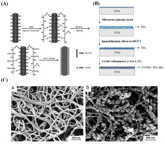 (A) Schematic diagram of the synthesis of polypyrrole nanofiber-supporting Au nanoparticles (Au/PPyNFs). Reproduced from [112] with permission from Elsevier. (B) Schematic diagram of the preparation of chitosan–polypyrrole/titanium oxide (CS-PPy/TiO2) nanocomposite films on a fluorine-doped tin oxide-coated glass slide (FTO). Reproduced from [113] with permission from MDPI. (C) Scanning electron microscope images of PPyNWs (a) and copper oxide (CuxO) nanoparticle-modified PPyNWs (b). Reproduced from [114] with permission from Elsevier.