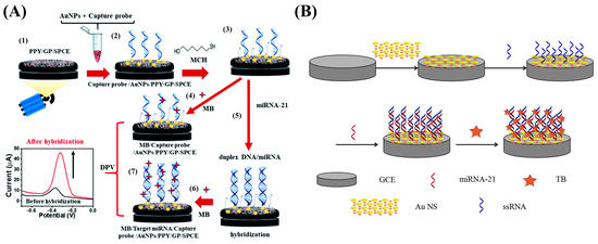 (A) Schematic diagram of the biosensor fabrication process utilizing PPy electrodeposition. Reproduced from [141] with permission from Elsevier. (B) Schematic diagram of the preparation procedure for the hybrid polydopamine/polypyrrole nanosheet (PDA-PPy-NS) biosensor for miRNA-21 determination. Reproduced from [83] with permission from the American Chemical Society.