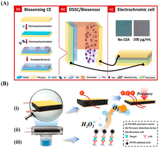 (A) Schematic diagram of the design of a self-powered and self-signaled biosensing platform based on biosensing, molecular imprinting technology, a dye-sensitized solar cell (DSSC), and electrochromic technology. Reproduced from [158] with permission from Elsevier. (B) Schematic diagram of a flexible pressure sensor based on the elastic three-dimensional (3D) structure of PPy foam. Reproduced from [143] with permission from the American Chemical Society.