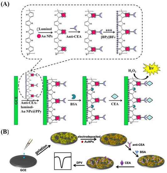 Zhu et al. constructed a novel ECL immune-based biosensor using anti-CEA–luminol–AuNP@PPy (Figure 11A) [144]. The PPy nanostructure made it possible to enhance the conductivity of the biosensor and provided a high specific surface area for the combination with the AuNPs, thus enabling the attachment of abundant amounts of the ECL reagent (luminol) and promoting the immobilization of antibodies. This strategy showed a detection range of 0.01 pg/mL–10 ng/mL and an LOD of 3 fg/mL, making it an effective tool for the clinical detection of CEA.