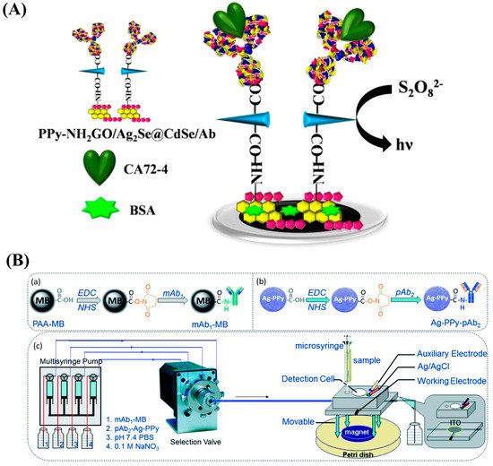 (A) Schematic diagram of the polypyrrole-intercalated aminated graphene/Ag2Se@CdSe (PPy-NH2GO/Ag2Se@CdSe)-based immunosensor for the CA72-4 assay. Reproduced from [148] with permission from the American Chemical Society. (B) Schematic diagram of the platform for CA125 measurement: (a) the preparation of the capture probe using mAb1-conjugated magnetic beads (mAb1-MB). (b) the preparation of the detection probe using pAb2-labeled Ag-PPy nanostructure (Ag-PPy- pAb2). (c) magneto-controlled microfluidic device with an electrochemical detection cell. Reproduced from [149] with permission from the Royal Society of Chemistry.