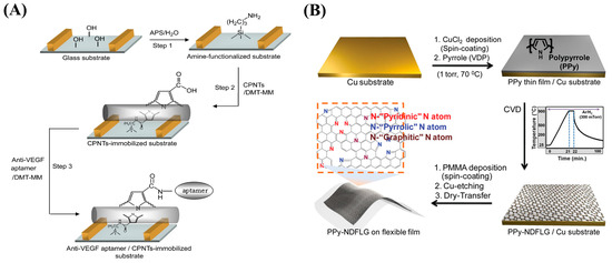(A) Schematic diagram of the fabrication of a CPNT-modified aptasensor for the VEGF assay. Reproduced from [155] with permission from Elsevier. (B) Schematic diagram of the process of synthesizing flexible PPy-NDFLG. Reproduced from [156] with permission from the American Chemical Society.