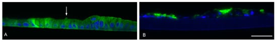 Immunochemical detection of tubulin (A) and identification of mucus-producing cells by anti-mucin 5AC staining (B). Tubulin is contained in high amounts in cilia and in lower amounts in the cytoskeleton. In the absence of cilia, the staining of the cytoskeleton and of immature cilia (arrow) is visible. Scale bar: 50 µm.