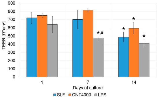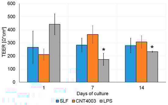 CNT4003 particles did not affect TEER values over the entire observation time of 14 d, whereas the initially higher TEER values of the cultures exposed to LPS were significantly decreased compared to 1 d at 7 d and 14 d (Figure 4).