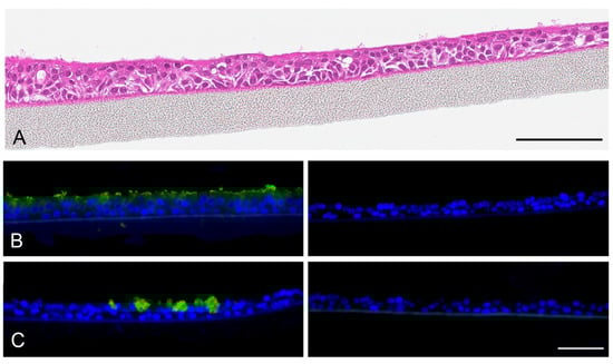 EpiAlveolar™ tissues consist of alveolar epithelial cells and fibroblasts at the apical site and endothelial cells at the basal site of the membrane [17]. In the hemalaun-stained sections, three to four rows of cells can be seen and tissues with THP-1 (Figure 7B) appear thicker than those without THP-1 (Figure 7A). In tissues with THP-1 cells, the macrophages were identified by CD45-immunoreactivity (Figure 7C).