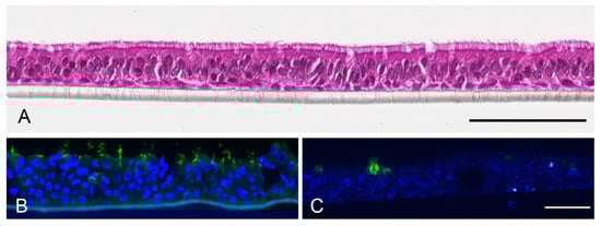 Morphology of MucilAir™ tissues according to hemalaun staining (A, scale bar: 100 µm) and cellular composition of the tissues according to immunocytochemistry (B,C). Anti-α-tubulin staining (green, (B)) visualized cilia of bronchial epithelial cells and anti-mucin 5AC staining (green, (C)) visualized goblet cells. Nuclei are counterstained with Hoechst 33342 (blue). Scale bar 50 µm.