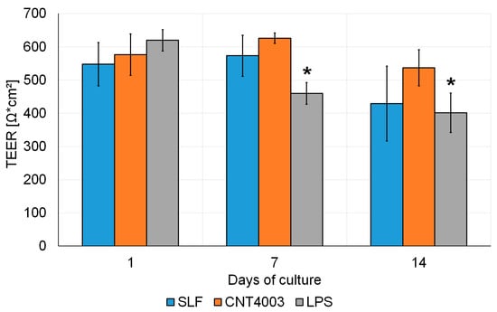 TEER values of the untreated MucilAir™ cultures significantly decreased over 21 d for cultures from 563 ± 66 Ω × cm2 at 1 d to 282 ± 24 Ω × cm2 at 21 d. Therefore, tissues were studied for only 14 d of exposure with LPS and CNT4003. While TEER values of the LPS-treated tissues were significantly decreased compared to 1 d, CNT4003 particles did not affect TEER values over the entire observation time of 14 d (Figure 6).