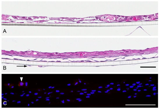 Radial section of EpiAlveolar™ tissues without THP-1 (A) and with THP-1 (B) macrophages. Endothelial cells at the basal side of the transwell membrane are visible in B (arrow). (C) CD45-immunoreactive THP-1 macrophages are rarely seen (arrowhead). Scale bar 50 µm.