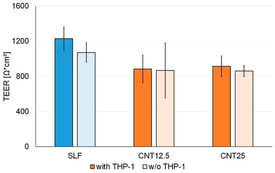 TEER values of EpiAlveolar™ tissues with and without THP-1 treated with control (SLF) or 12.5 and 25 µg CNT4003 particles at 7 d.