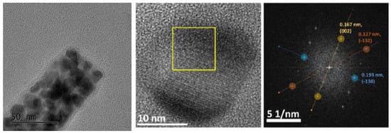 Comparing the spectra of pure NiPx and CoPx with the mixed one, we cannot exclude the co-presence of phase-pure Ni2P and CoP in the mixed compounds Co0.75Ni0.25Px and Co0.50Ni0.50Px. Indeed, the presence of Ni2P in Co0.50Ni0.50Px is confirmed by high-resolution TEM in Figure 4, where on a needle, 10 nm Ni2P particles are clearly identifiable by microdiffraction.