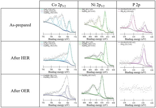 In the spectra of the as-prepared samples, both phosphide and oxidized components are present. The presence of oxidized species is attributed to the oxidation of phosphides in contact with air. With regard to the Co 2p3/2 core level, three components are distinguished: CoPx at a binding energy (BE) of 779.1 eV, Co(PO)x at 782.0 eV, and a small amount of cobalt oxide Co3O4 at 779.9 eV [40]. In the case of the Ni 2p3/2 peak, only NiPx at 853.7 eV and Ni(PO)x at 857.9 eV are present, whereas hydroxide or oxide species are not detectable [41]. The P 2p photoemission line shows three components related to phosphide at 129.3 eV, P-Ox at 132.2 eV, and POx-Hy at 134.0 eV [42].
