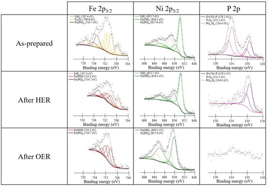 The P 2p signal shows substantial similarities with that measured in Co0.50Ni0.50Px (Figure 5). For the as-prepared sample, three different components are present: one related to Fe-Ni Px at 129.1 eV and two oxidized components, i.e., the signal of the P-Ox at 132.2 eV and the one for POx-Hy at 134.0 eV. These three components are also maintained after HER with a strong reduction of the P-Ox species. As in the case of the Co0.50Ni0.50Px sample, after OER, the P 2p signal decreases severely, indicating only the presence of some phosphate residues in both the Fe 2p3/2 and Ni 2p3/2 spectra. This proves that by applying an oxidizing potential in an alkaline environment, most of the P is removed from the surface.