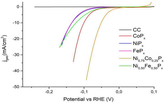 The values reported in the literature are comparable to those obtained in this work. It should be noted that the value reported for FePx (96 mV) [43] refers to a catalyst that had undergone a pre-treatment in acid to remove the surface phosphate and increase the electrochemical performance; therefore, it is not directly comparable to ours. The overpotential of 50 mV to reach 10 mA observed for Ni0.75Co0.25Px places this material at the top of the activity among most performing materials in the literature.