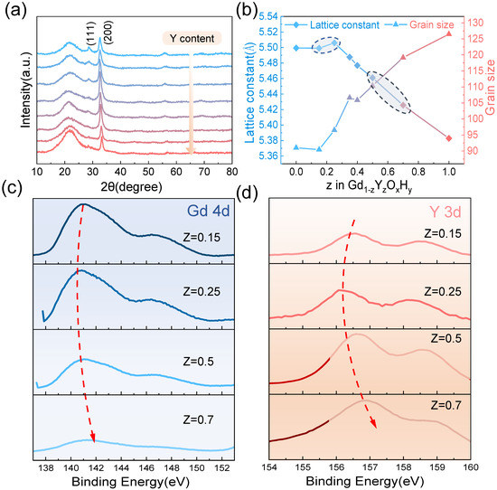 (a) The X-ray diffraction pattern and (b) the lattice constants and grain size of different Y and Gd content. The XPS spectra show (c) Gd 4d and (d) Y 3d binding energies.