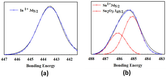 The XPS results of the ITOX thin films for (a) In1+ 3d5/2, and (b) Sn1+ 3d5/2, Sn2O3 3d5/2 peaks.