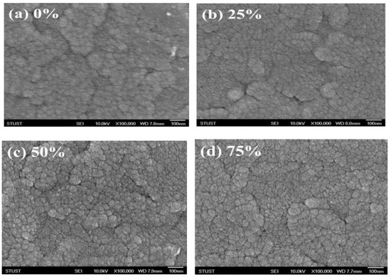 Figure 4 depicts the surface micro-structure morphologies of ITOX thin films at different oxygen growth procedure parameters. More non-uniform grains and rather bumpy surfaces were found in 0% and 25% oxygen growth procedure parameters. As shown in Figure 5c,d, the denser surfaces of thin films for 50% and 75% oxygen growth procedure parameters was increased. In addition, the oxygen vacancies were the main factor for the electrical current transport paths under the different oxygen sputtering growth procedure parameters. The electrical transport conduction paths affected by the variation in oxygen vacancies of ITOX thin films for the 50% oxygen growth procedure parameters were improved in I-V curves switching behaviors.