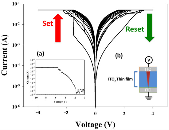 The typical I–V curves of the ITOX thin films RRAM devices are shown in Figure 7. The electrical current compliance is 5 mA in Figure 7a. The MIM capacitor structure of the ITO/ITOX/ITO RRAM devices is shown in Figure 7b. For the initial forming process at a voltage of −10 V, the ITOX thin films from the RRAM devices switch to the low resistance state (called LRS) and the high resistance state (called HRS). To discuss and confirm the stable I–V switching behavior, the LRS/HRS states of the ITOX thin films of the RRAM devices were repeated 100 times.