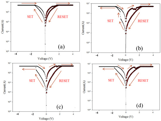 Many previous studies have suggested ways to prove the electrical transport conductive behaviors of the RRAM devices: the modification of the Schottky mechanism for the trapped charge carrier model, the conductive filamentary path model, the migration of oxygen vacancies model, and the carriers tunneling model [22,23,24,25]. In addition, many studies attempted to elucidate the I-V resistive switching properties of RRAM devices.