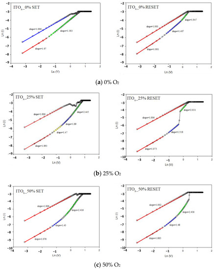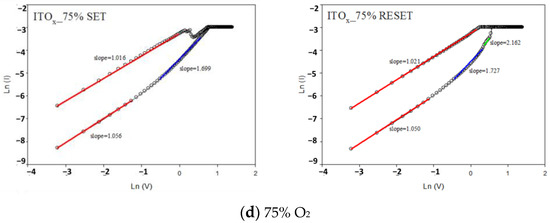 Figure 10 depicts the I-V curves characteristics (Ln (I) as the vertical axis and Ln (V) as the horizontal axis) of the ITO/ITOX/ITO RRAM devices under 0, 25, 50, and 75% different oxygen growth procedure parameters. According to experimental results, the electrical current conduction mechanism was ohmic conduction (external electric field dominated, slope ≈ 1) for low voltages. As high voltages were applied, the defects filled by the carriers of electrical conduction mechanisms were caused by the space charge limit conduction (SCLC, slope ≈ 2). The electrical conduction mechanisms exhibited both ohmic conduction and SCLC mechanisms (slope = 1~2.5). The electrical current density of the ohmic conduction and SCLC was written as [26]:
