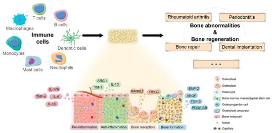 Osteoimmunomodulation refers to the modulation of the immune system to make the local immune environment beneficial for bone regeneration. It aims to use functional materials to regulate the immune cell responses to sequentially modulate the bone remodeling processes, facilitating bone healing [106]. It involves regulating immune cells or cytokines to influence bone remodeling and maintain bone health [107].