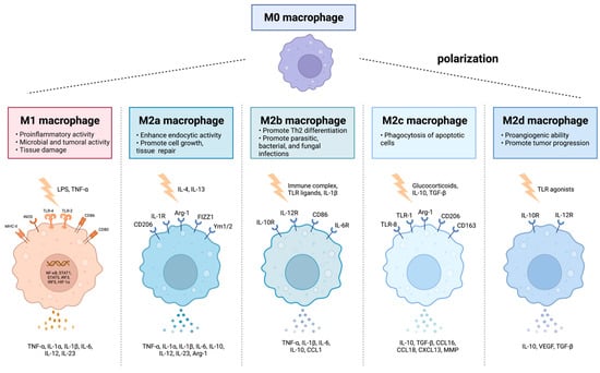 Macrophages have been characterized as unpolarized M0, pro-inflammatory M1 phenotypes, and anti-inflammatory M2 phenotypes (M2a, M2b, and M2c) with different functions. Created with BioRender.com.