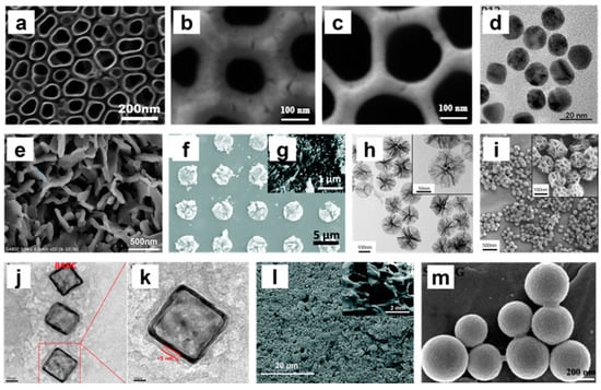 Composite images (TEM and SEM images) of different nanoparticle structures. (a) SEM image of 110 nm titania nanotubes (TNTs) [116]; (b,c) SEM images of anodic alumina structures with different sized pores (100 nm and 200 nm) [119]; (d) TEM image of peptide-coated gold NPs (P12) [112]; (e) SEM image of surface morphology of SIS/SrHA [150]; (f,g) SEM images of HA bioceramics with nanoneedle structures. (g: high magnification image) [120]; (h) TEM images of 150 nm extra-large pore mesoporous silica NPs (XL-MSNs) (inset: high magnification image) [133]; (i) SEM images of 150 nm XL-MSNs (inset: high magnification image) [133]; (j,k) TEM images of biomimetic anti-inflammatory nano-capsules (BANC) [139]; (l) SEM image of 5 wt% ZnO incorporated microcrystalline bioactive glass (5Zn-MCBG) [149]; (m) SEM image of strontium-substituted submicrometer bioactive glass (Sr–SBG) [124]. Reprinted/adapted with permission from Ref. [112]. Copyright 2020 Wang, Zhang, Sun, Gao, Xiong, Ma, Liu, Shen, Li and Yang. Ref. [116]. Copyright 2019 Shen, Yu, Ma, Luo, Hu, Li, He, Zhang, Peng and Song. Ref. [119]. Copyright 2017 Chen, Ni, Han, Crawford, Lu, Wei, Chang, Wu and Xiao. Ref. [124]. Copyright 2016 Zhang, Zhao, Huang, Fu, Li and Chen. Ref. [133]. Copyright 2017 Kwon, Cha, Cho, Min, Park, Kang and Kim. Ref. [139]. Copyright 2020 Yin, Zhao, Li, Zhao, Wang, Deng, Zhang, Shen, Li and Zhang. Ref. [149]. Copyright 2021 Bai, Liu, Xu, Ye, Zhou, Berg, Yuan, Li and Xia. Ref. [150]. Copyright 2021 Yang, Zhou, Yu, Yang, Sun, Ji, Xiong and Guo.