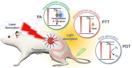 PDT is another type of phototherapy that uses a photochemistry based approach. In PDT, light-activatable chemicals called photosensitizers are used to destroy diseased cells []. Photosensitizers are not cytotoxic until they are activated via illumination. After activation using a specific wavelength of light energy, the electrons in the photosensitizers are excited to a very unstable singlet state. Thereafter, excess energy is released in three ways: (1) radiative relaxation, which produces fluorescence; (2) nonradiative decay, which releases heat; and (3) internal conversion, which produces cytotoxic reactive oxygen species (ROS), such as singlet oxygen, superoxide radicals, hydroxyl radicals, and hydrogen peroxide []. The photosensitizer concentration at the target site is a key factor for improving the efficacy of PDT []. To evaluate the targeting efficiency, PAI has also been used to visualize the biodistribution of photosensitizers.