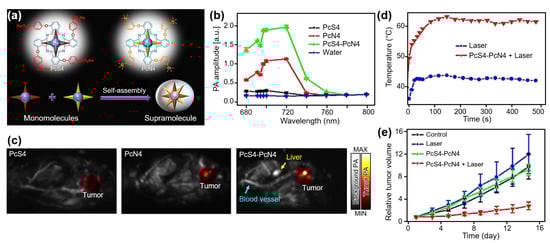 Phthalocyanine (Pc) is another type of organic material that has been widely used as a functional dye owing to its easily adjustable photochemical properties for strong absorption in the NIR region. While Pc dyes have mainly been studied as photosensitizers for PDT, Li et al. reported a Pc-based theranostic agent that showed a high PA signal and PTT ability []. They fabricated a supramolecular assembly using zinc Pc tetrasubstituted with 4-sulfonatophenoxy (PcS4) and 3-(N,N,N-trimethylammonium) phenoxy (PcN4) groups (Figure 4a). The developed agent exhibited strong PA signals at an excitation wavelength of ~700 nm (Figure 4b). To evaluate the in vivo contrast enhancement, PA images were obtained from 4T1 breast tumor xenografted mice after the intraperitoneal injection of the developed PcS4-PcN4 with a 200 μM concentration and 200 μL volume (Figure 4c). From the whole-body PA images, the signal enhancement at the tumor site was observed after the injection of the PcS4-PcN4 supramolecules. In contrast, no remarkable signal enhancement was observed in the mice injected with PcS4 or PcN4. The results showed that supramolecular interactions between PcS4 and PcN4 significantly enhanced the visibility of PA images. Moreover, the photothermal efficiency of PcS4-PcN4 was evaluated by monitoring the temperature under the 660 nm laser illumination (Figure 4d). Compared to the control group, the PcS4-PcN4-delivered site showed a temperature increase of approximately 25 °C. Accordingly, the relative tumor volume after treatment showed the treatment ability of PcS4-PcN4-assisted PTT, with a much slower size increase (Figure 4e).